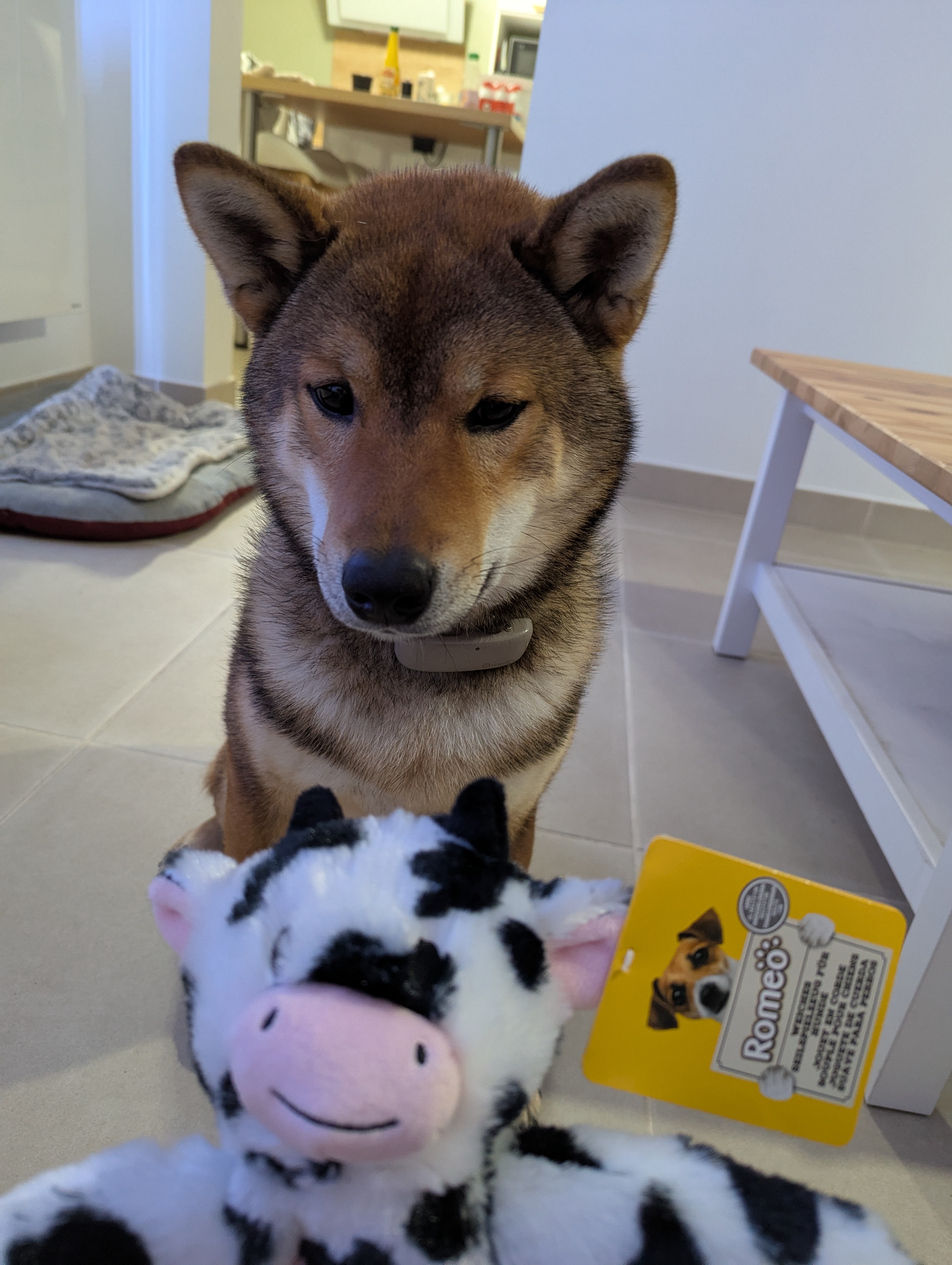 Aujourd'hui Yoshi a 1 an !🎉 Son cadeau une peluche vache 🥰